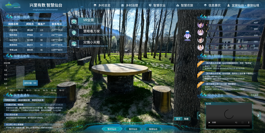 其中,“1”代表1个农旅融合数字化中枢平台,承担数据汇聚与功能调度的核心枢纽作用;“3”对应乡村治理、农旅融合、智慧农业三大智慧引擎,针对不同领域发展难题提供精准解决方案;“N”则延伸拓展出23项场景化应用,涵盖村民积分制管理、无人机巡查与AI预警、智慧农旅导览、网上人民意见征集、农产品销售等模块,最终实现从“被动治理”到“主动服务”的全场景数字化覆盖。