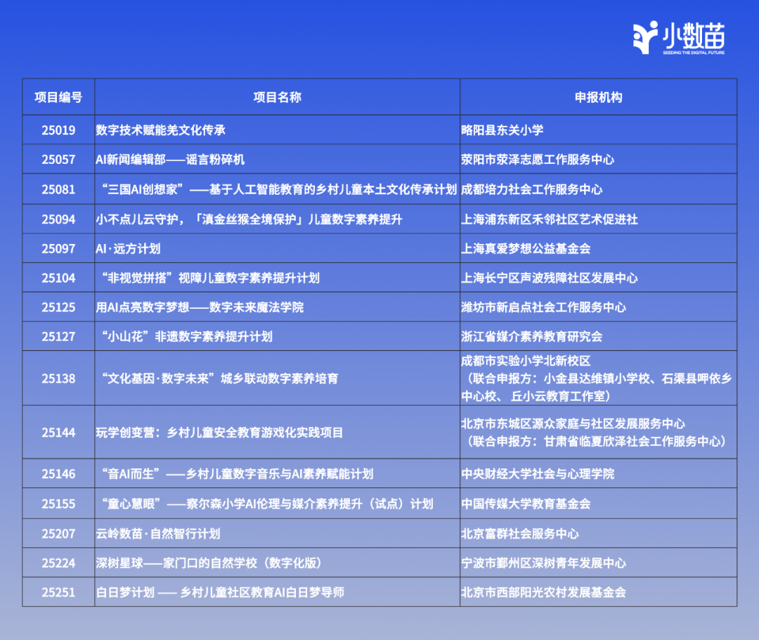 2024-2025年为项目第一期,“小数苗”计划共收到225份覆盖全国29个省市及自治区的有效提案,最终15个项目入选,共享400万元资助金,于2025年落地实施,将进入100余所乡村学校及社区,惠及约1.2万名乡村儿童。